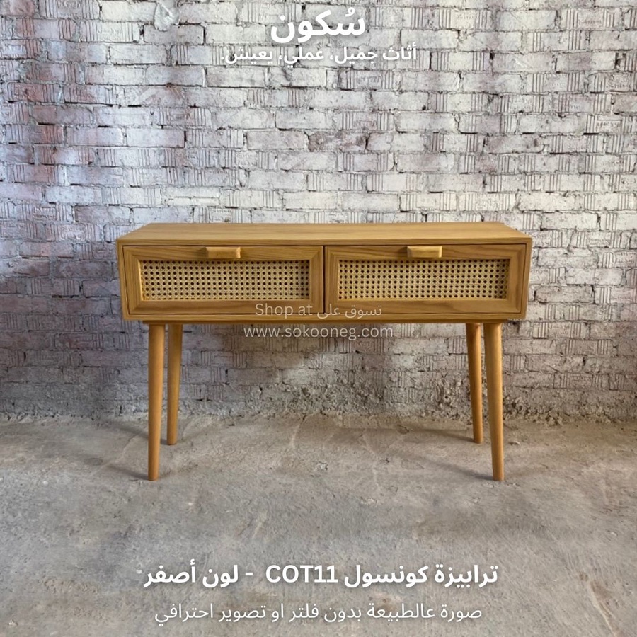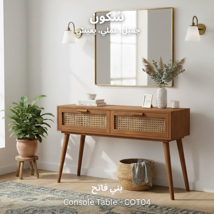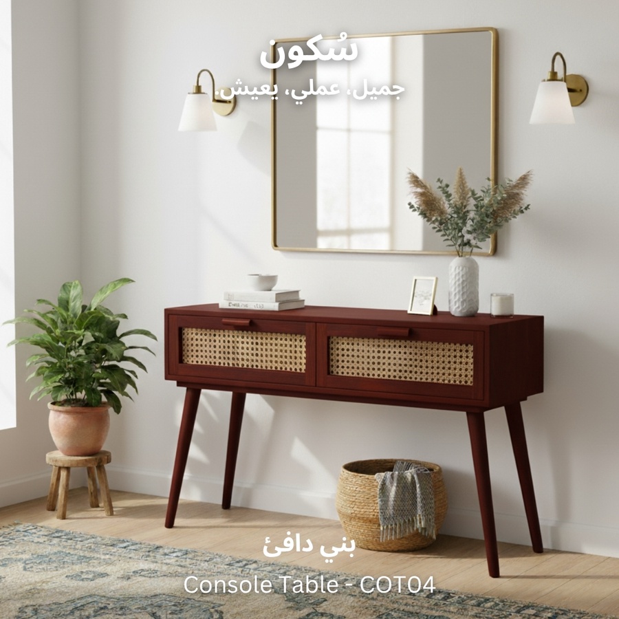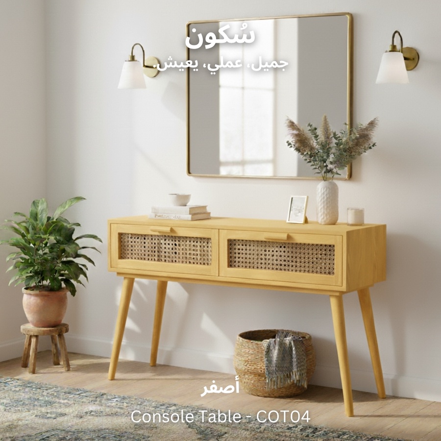 ترابيزة كونسول خشب طبيعي بأربع أرجل بتصميم عصري، مع درجين من الكانيه لتخزين عملي وأناقة فريدة.