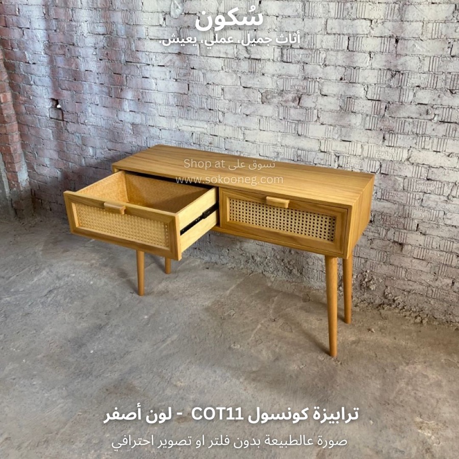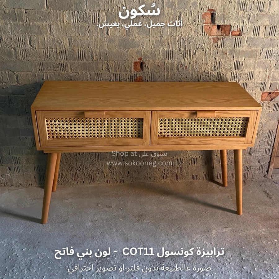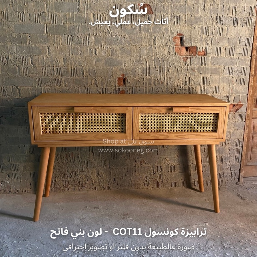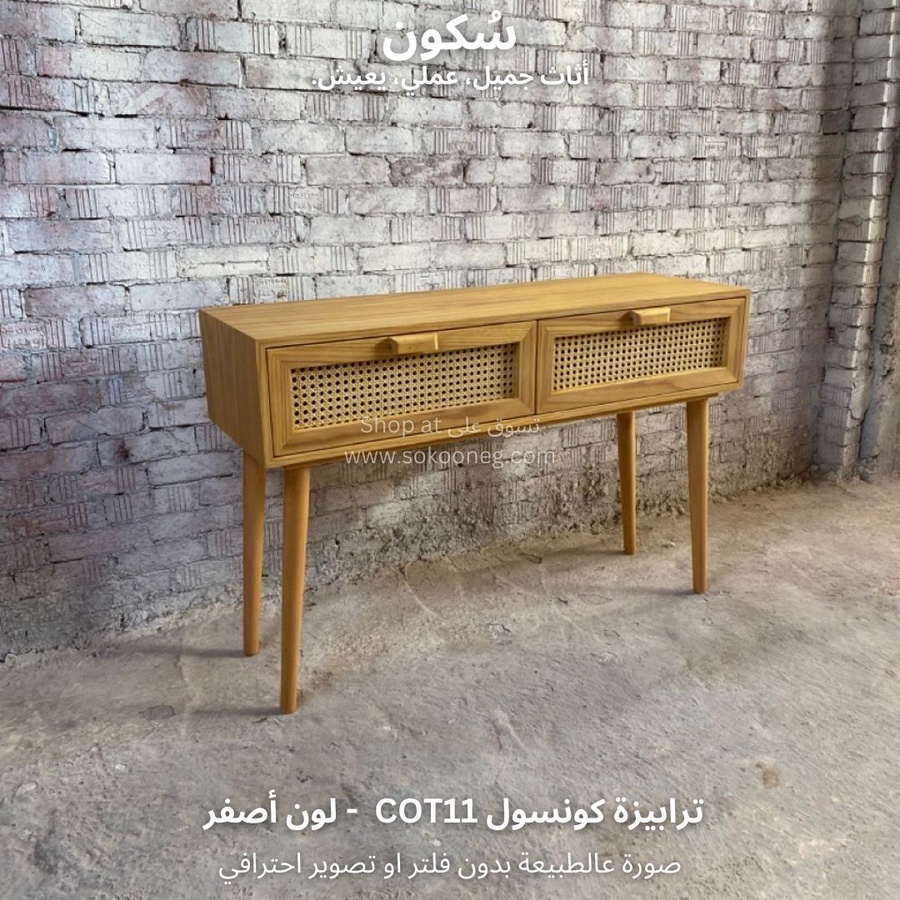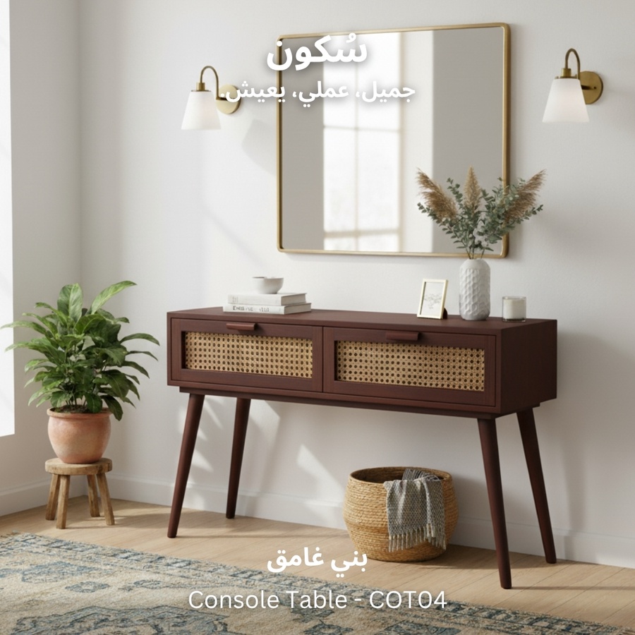 ترابيزة كونسول خشب طبيعي بأربع أرجل بتصميم عصري، مع درجين من الكانيه لتخزين عملي وأناقة فريدة.
