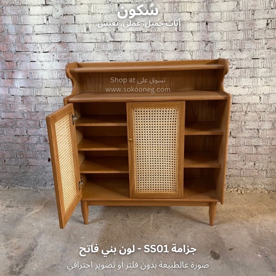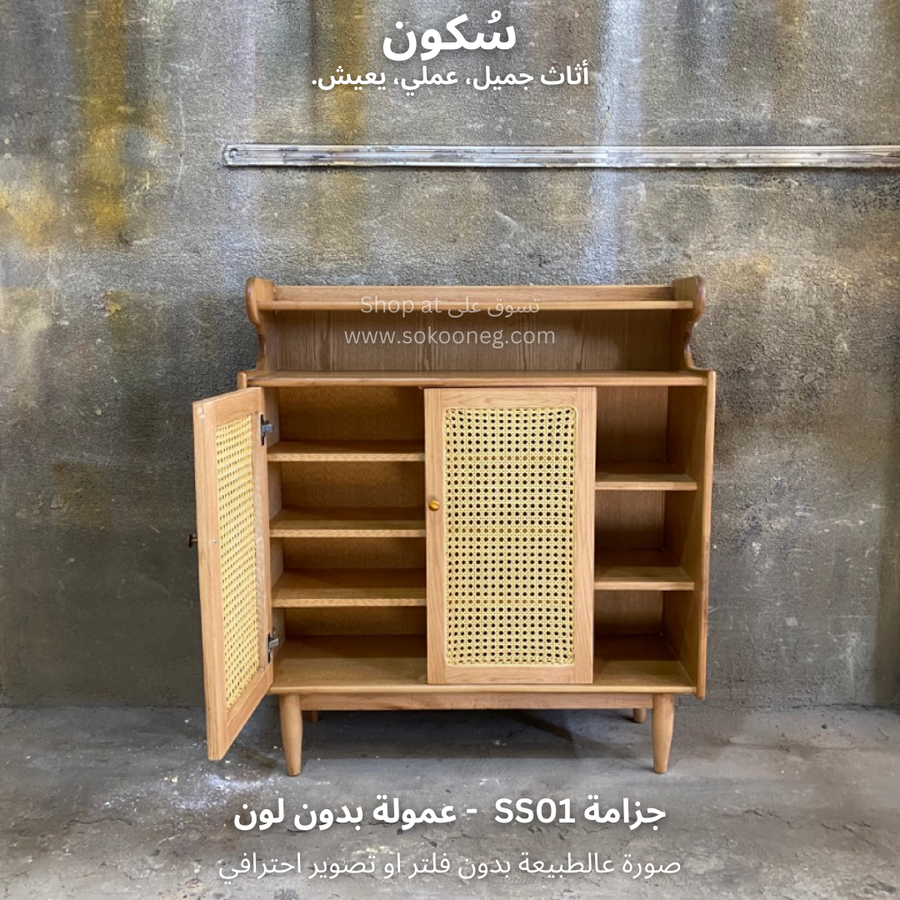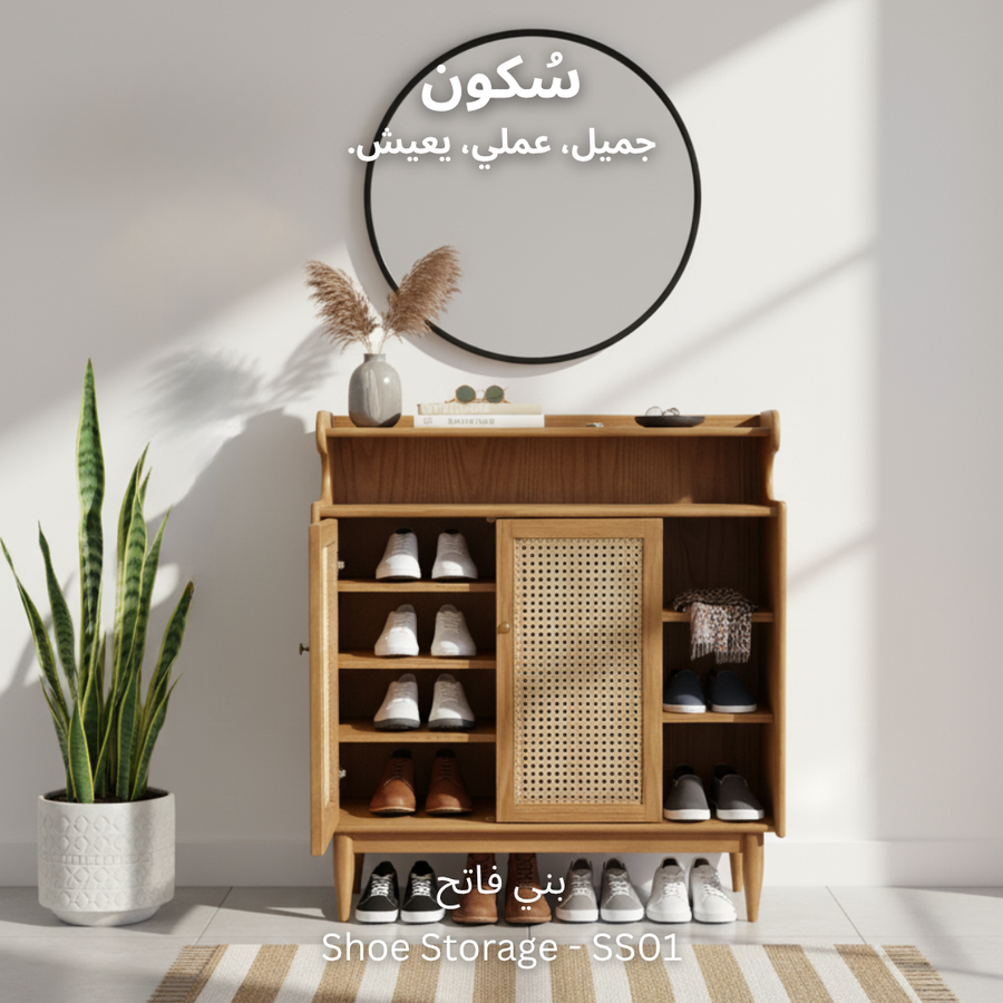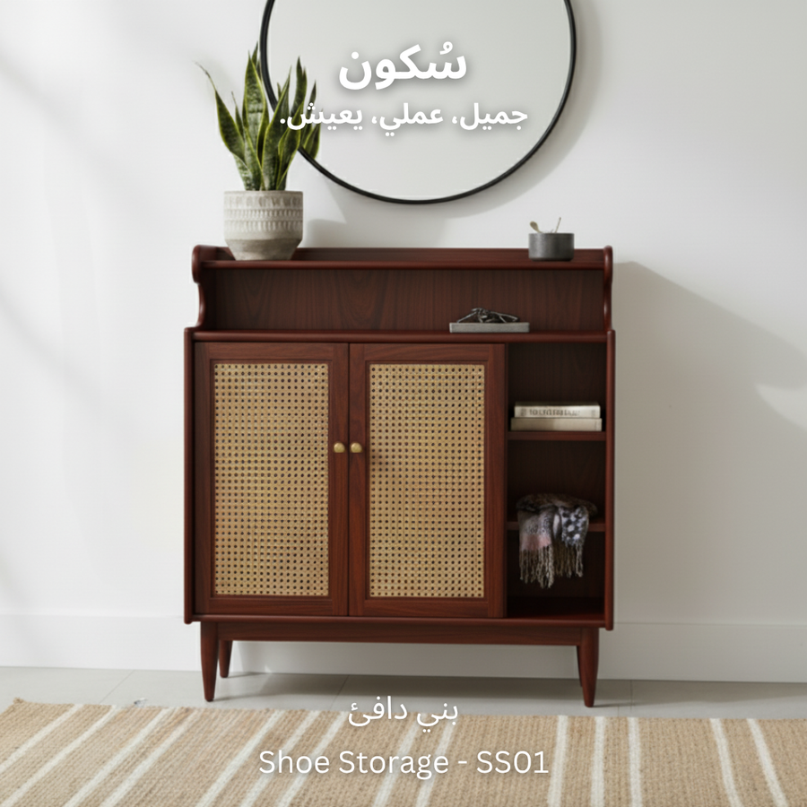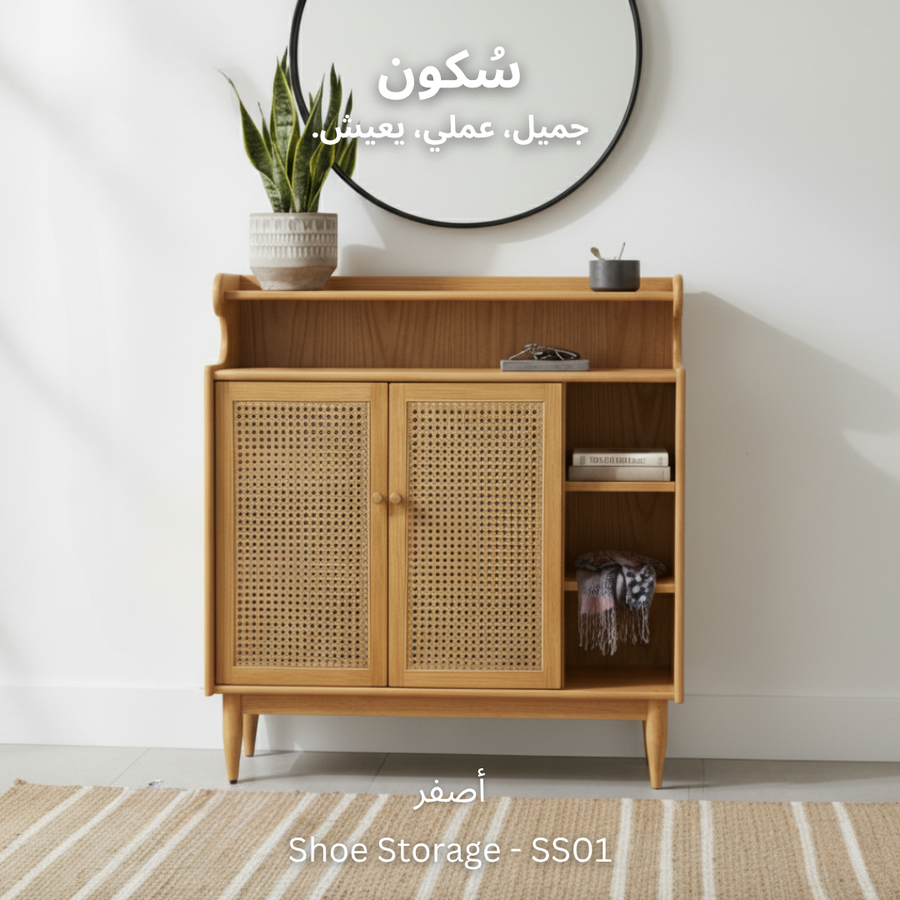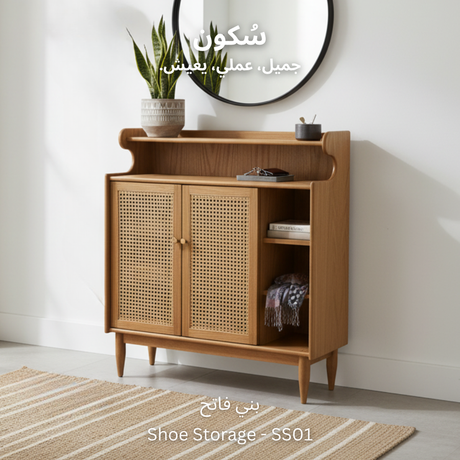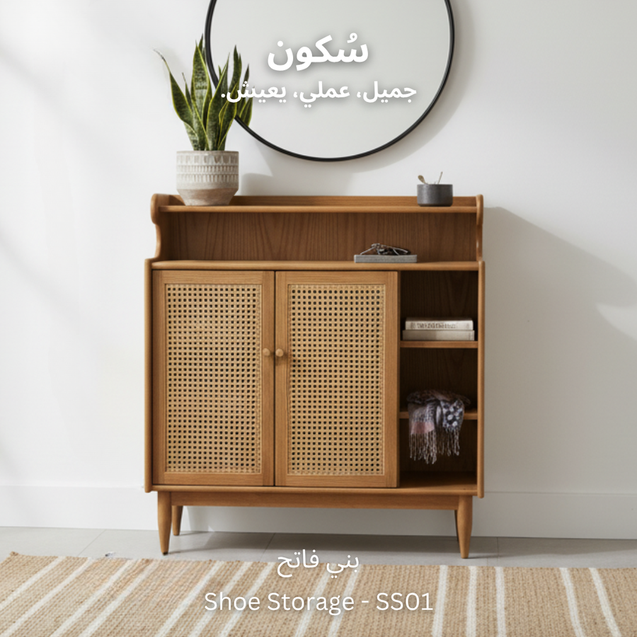 تصميم ذكي لجزامة خشب طبيعي مع درفتين من الكانيه، رفوف للأحذية والديكور، ومساحة تخزين عملية وسهلة الاستخدام.