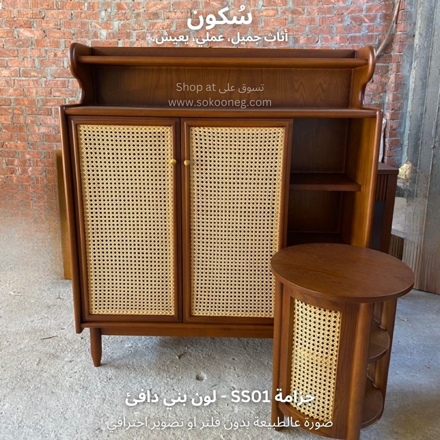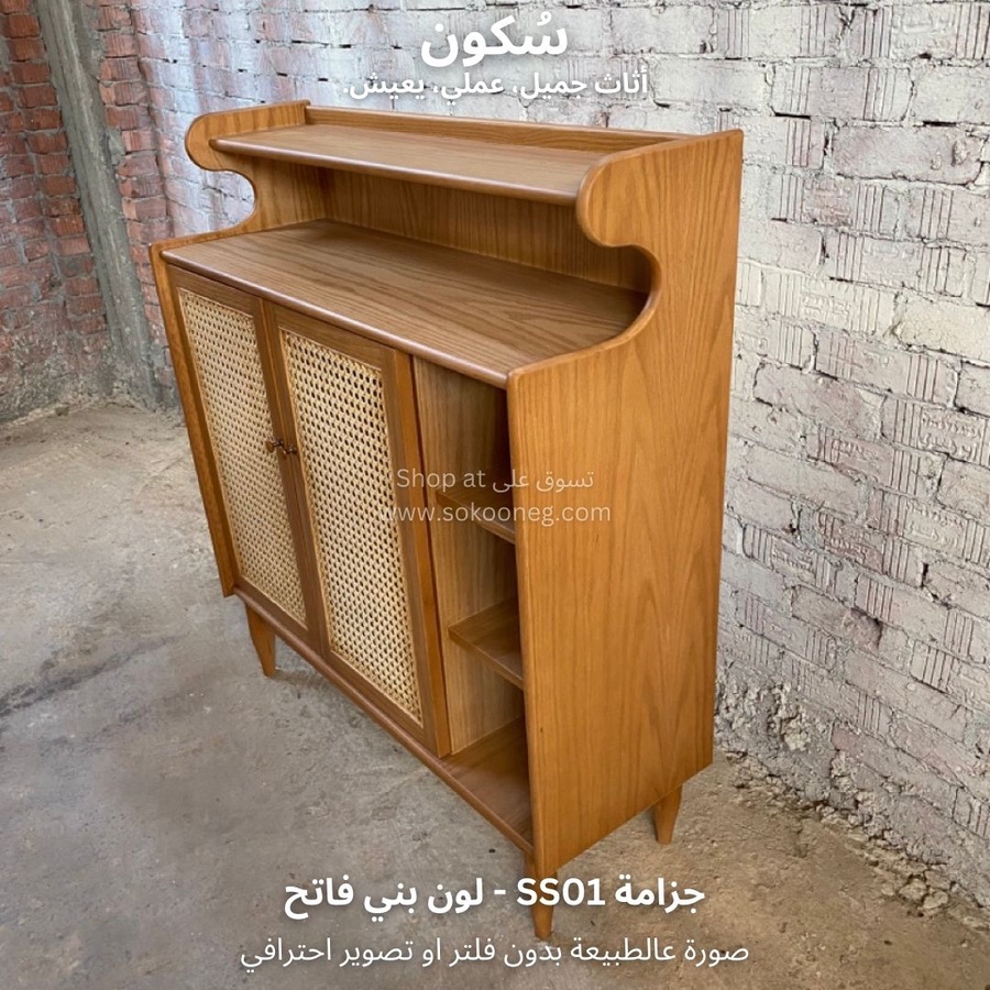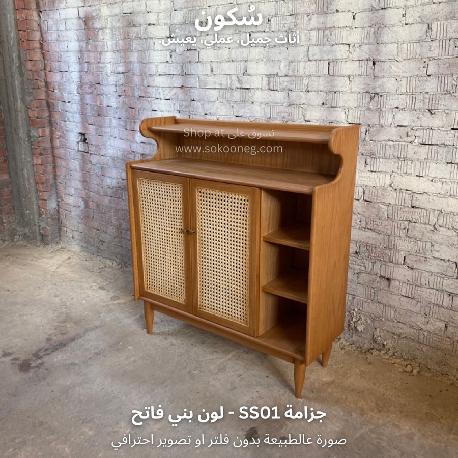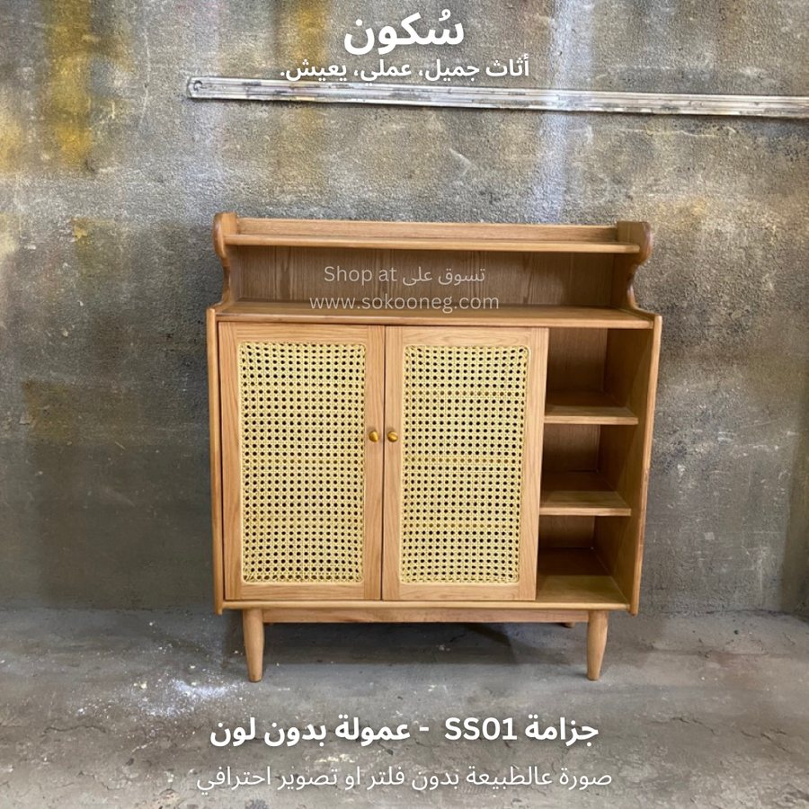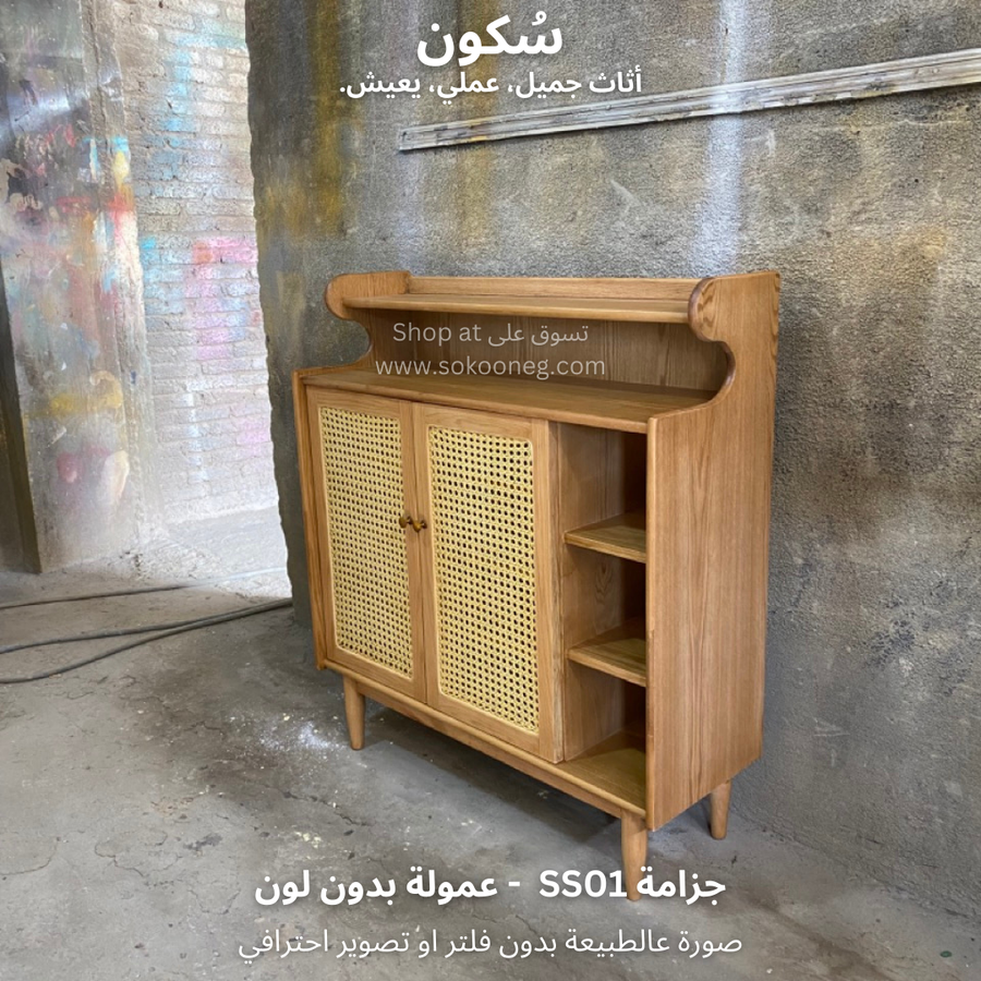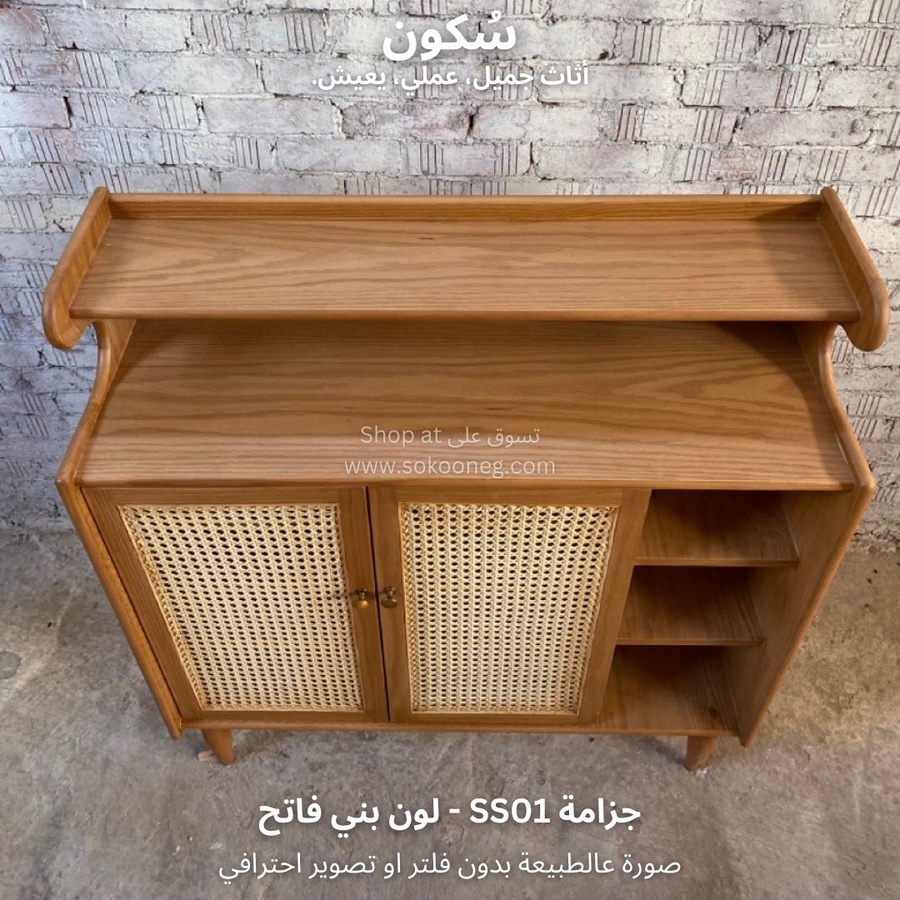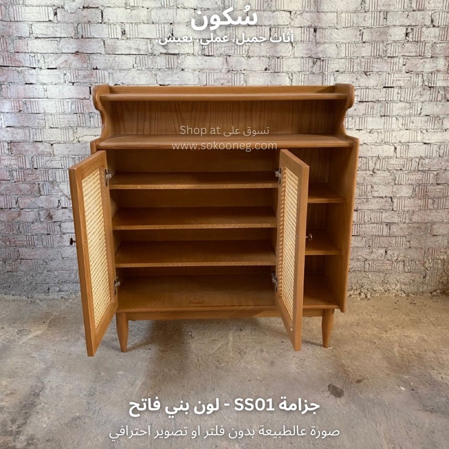 تصميم ذكي لجزامة خشب طبيعي مع درفتين من الكانيه، رفوف للأحذية والديكور، ومساحة تخزين عملية وسهلة الاستخدام.