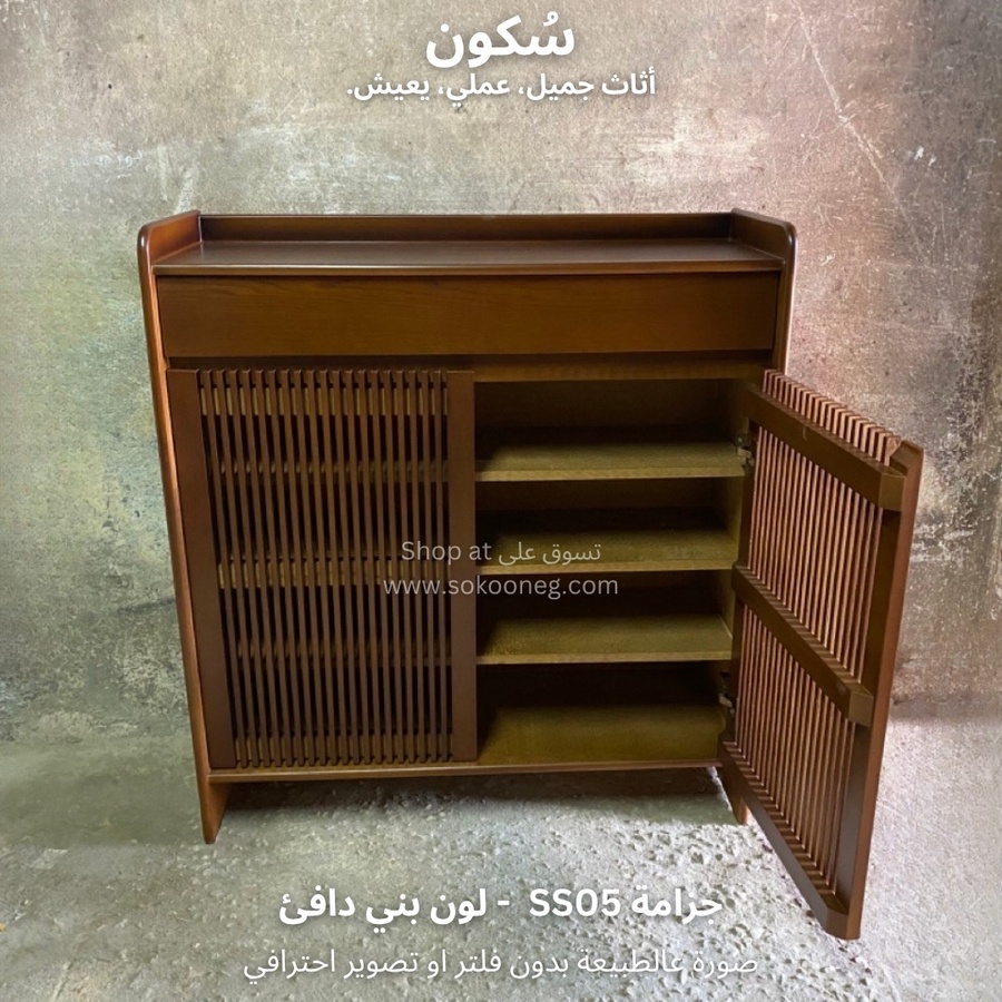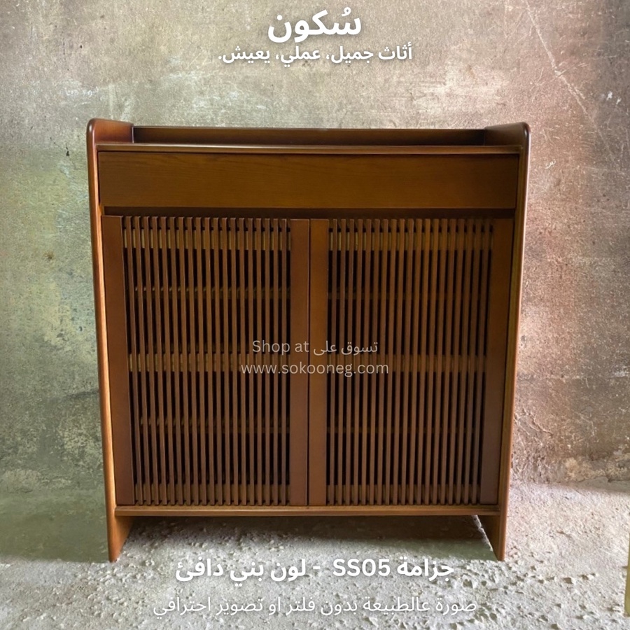 تصميم ذكي لجزامة خشب طبيعي مع درفتين ودرج، ومساحة تخزين عملية وسهلة الاستخدام.