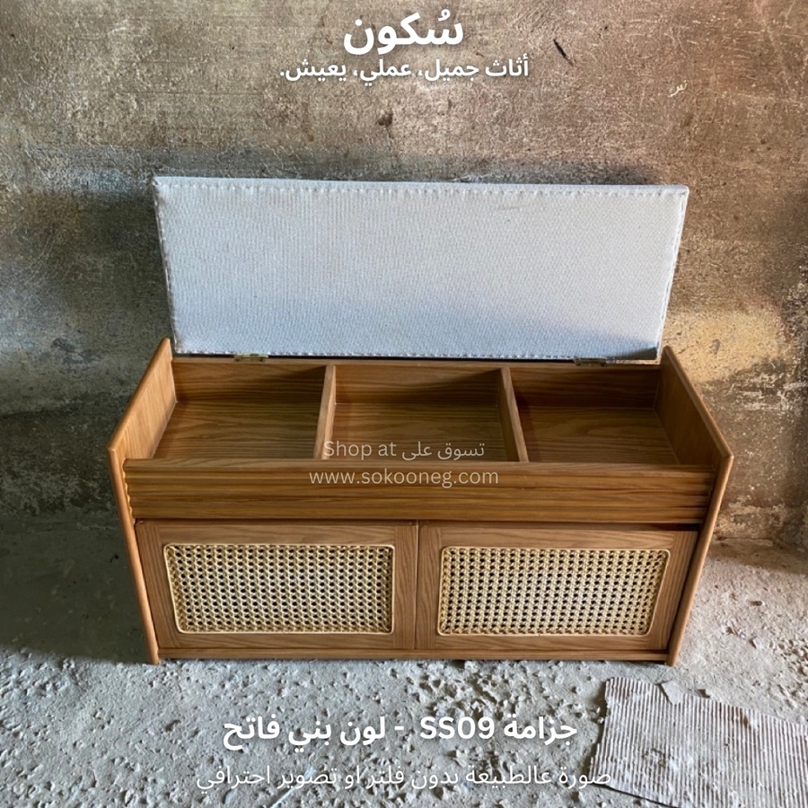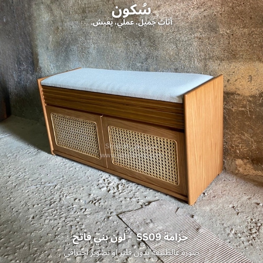 جزامة خشب طبيعي بدرفتين كانيه وسطح جلوس، مع رف تخزين منفصل للأغراض ورفوف مخصصة للأحذية بمختلف الأحجام.