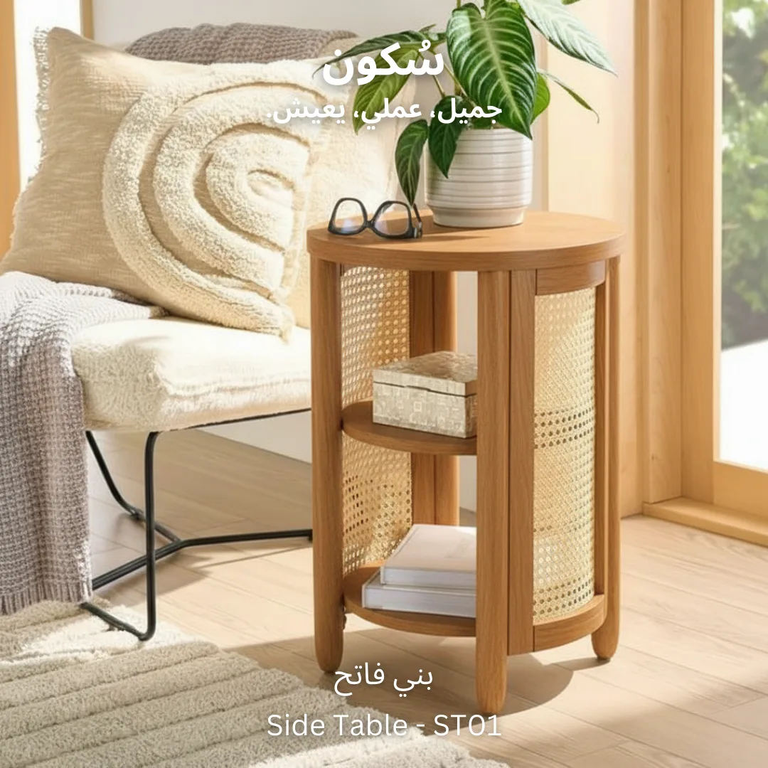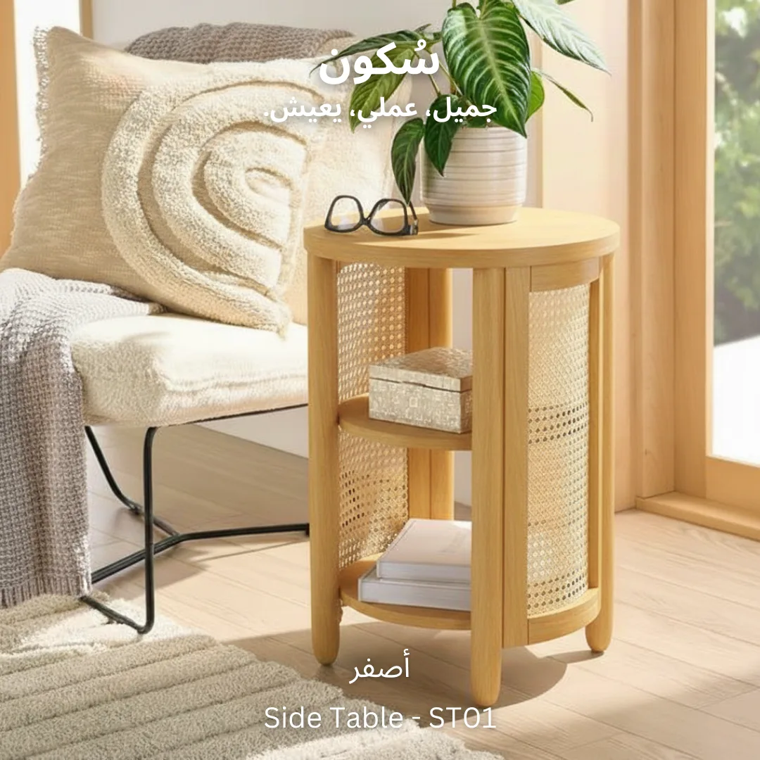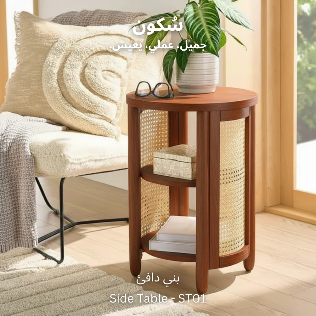 ترابيزة جانبية تجمع بين الجمال والوظائف العملية، مع جوانب من الكانيه التي تضيف لمسة من الطبيعة وسطح ورفين لتخزين الأغراض الصغيرة بطريقة منظمة تعزز من راحة مساحتك.