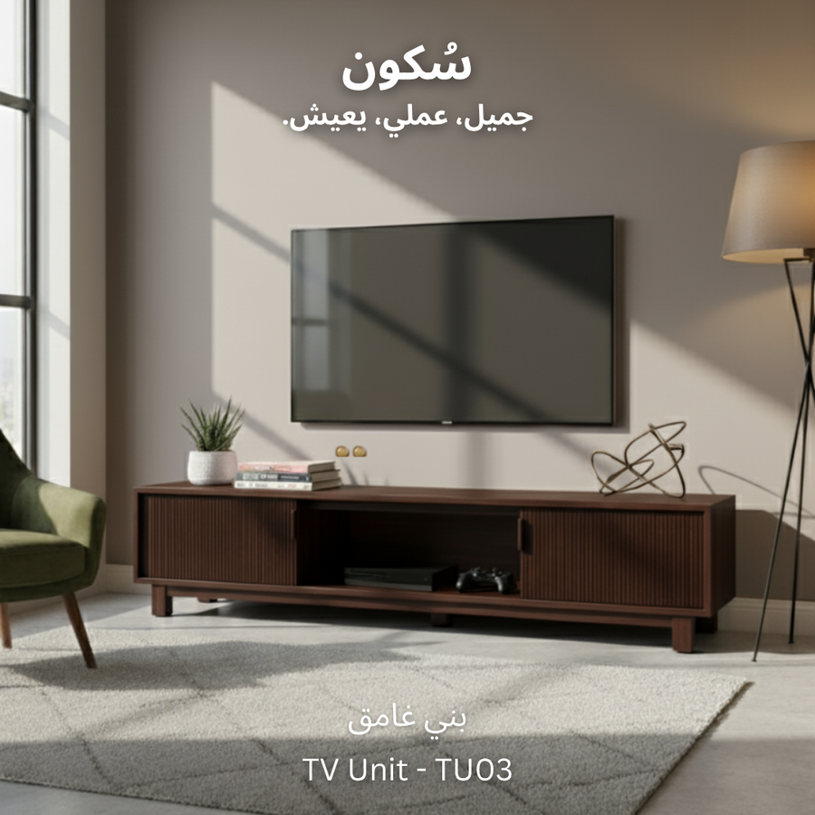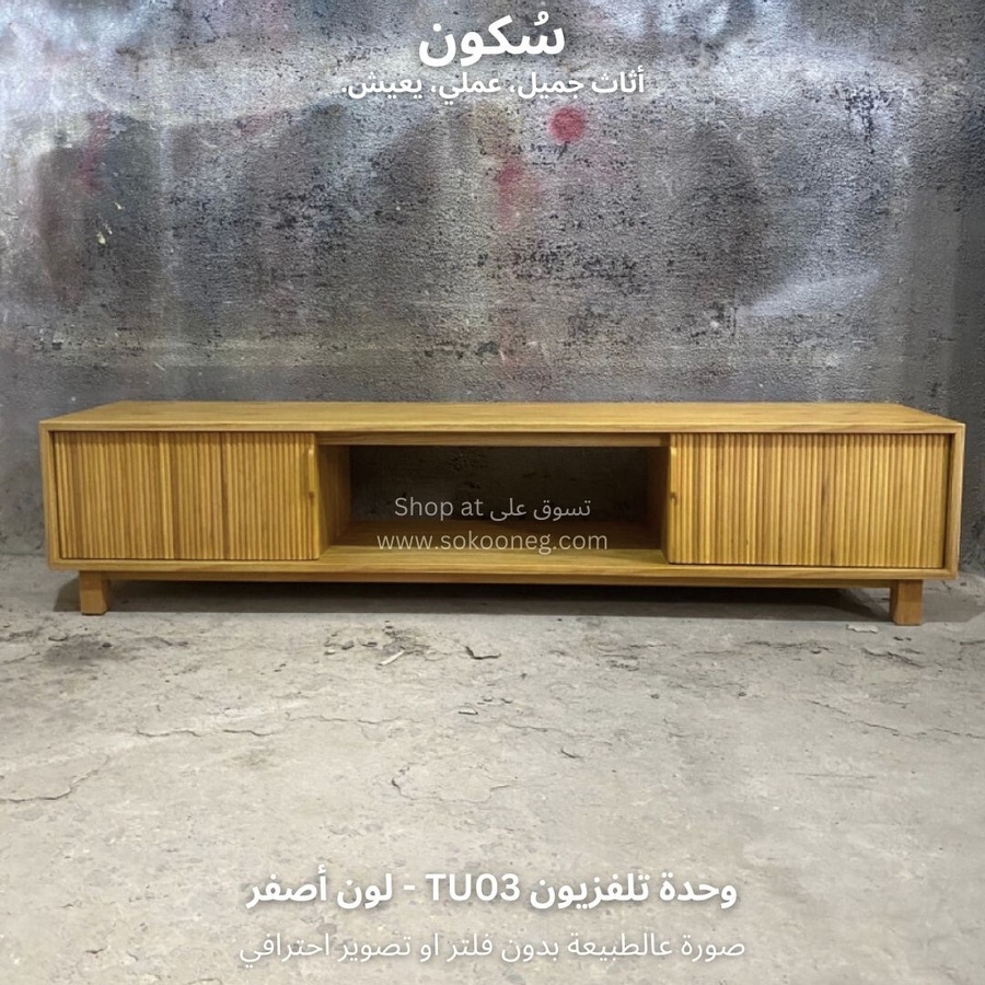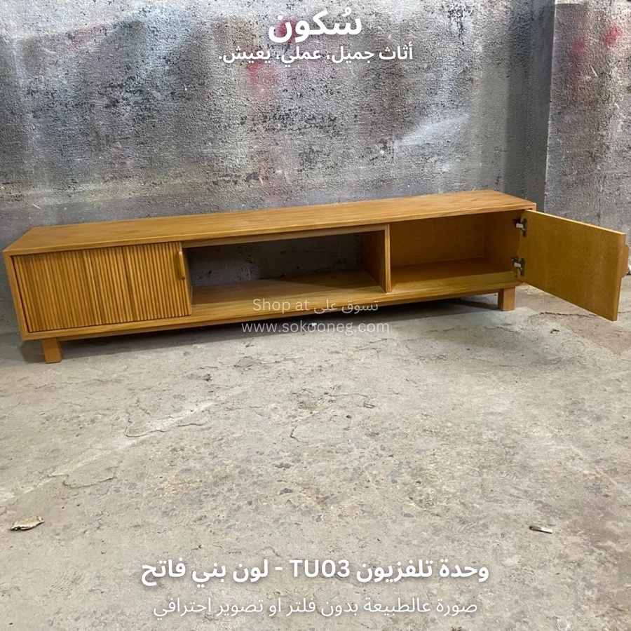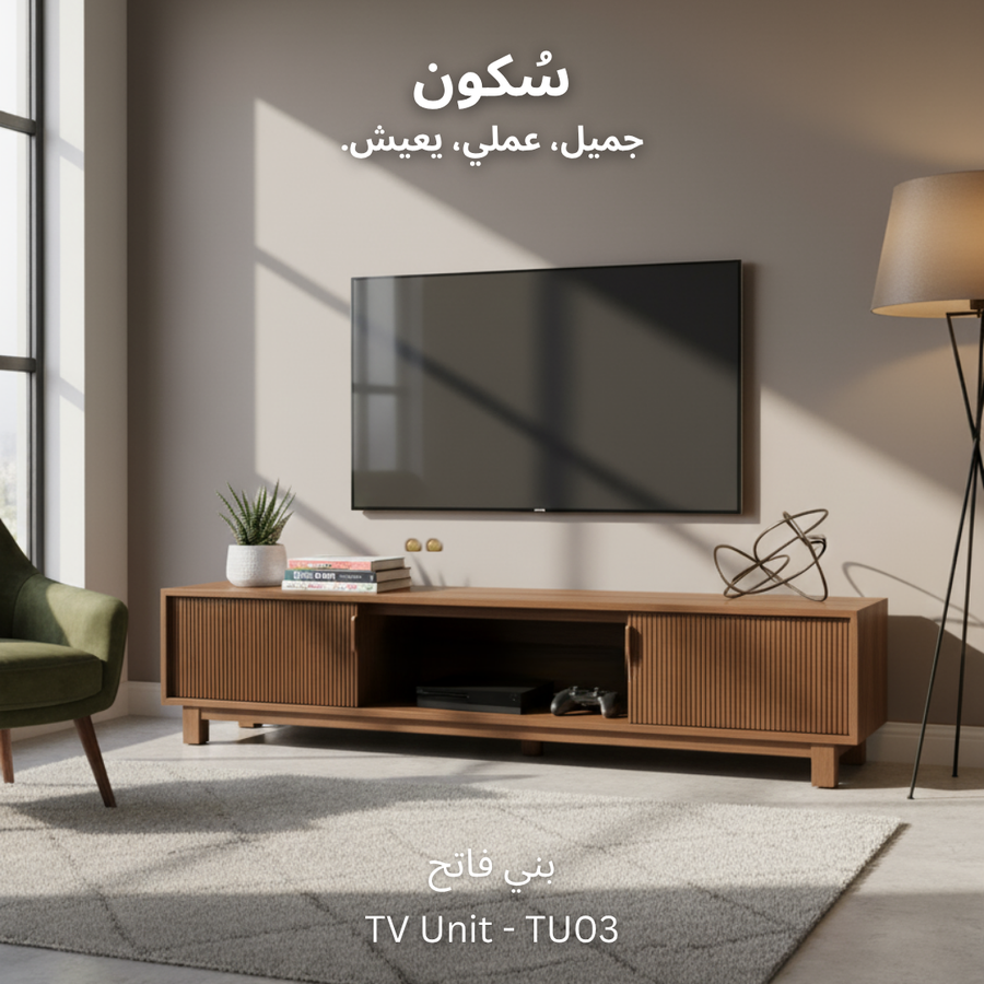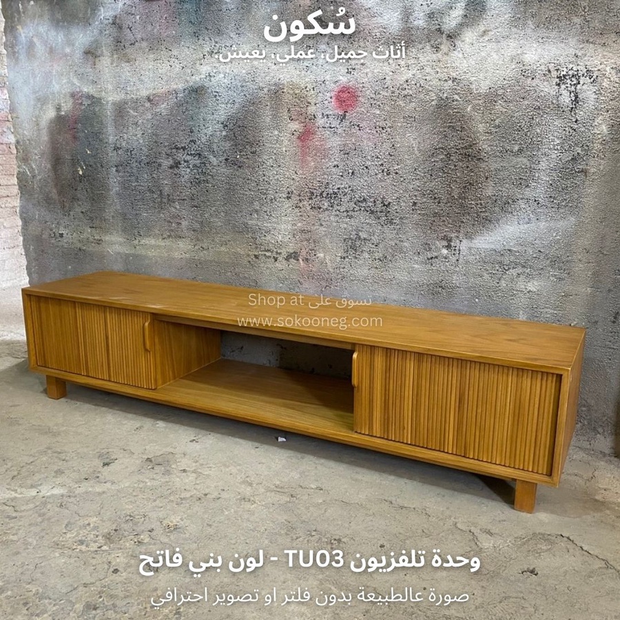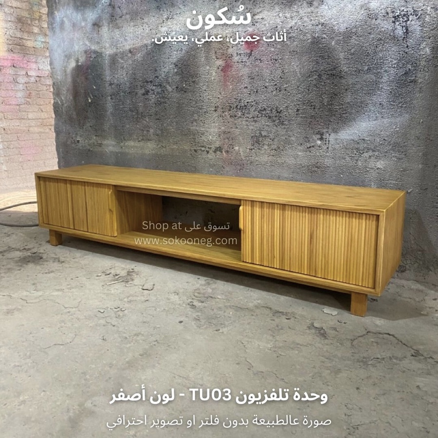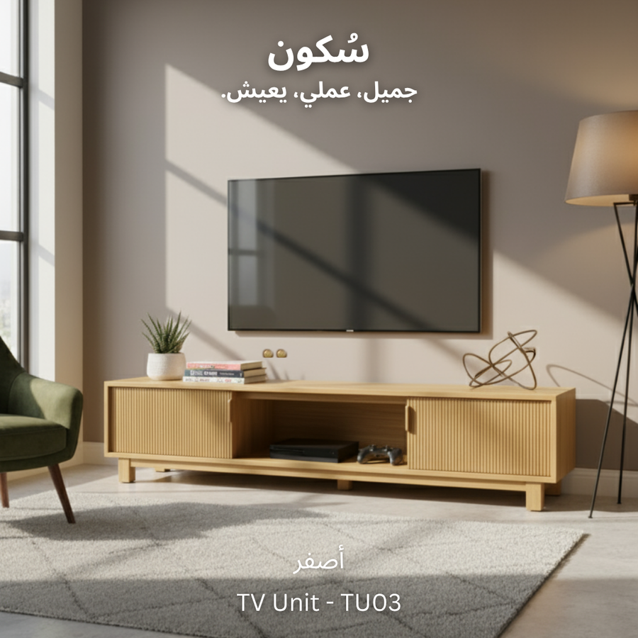 وحدة تلفزيون مع سطح واسع للاستخدام اليومي، تحتوي على بابين لتخزين الأغراض ورف واسع يوفر لك الوصول السريع للأغراض أو الأجهزة الإلكترونية.