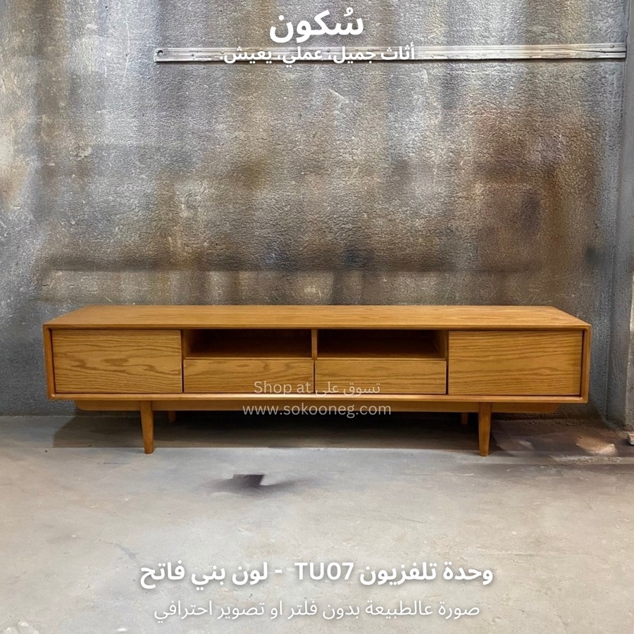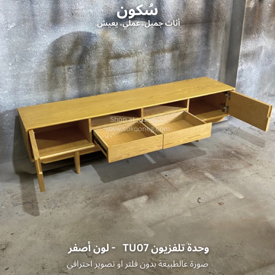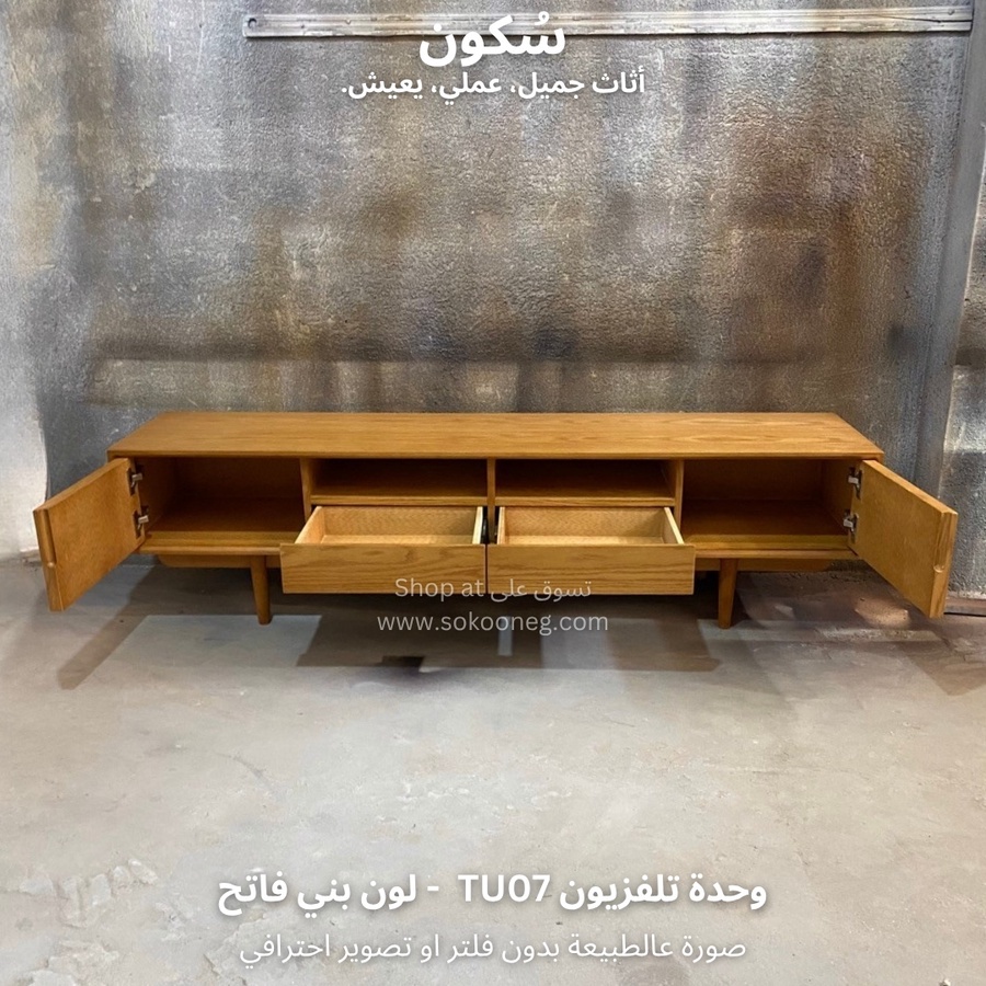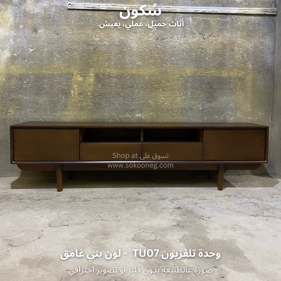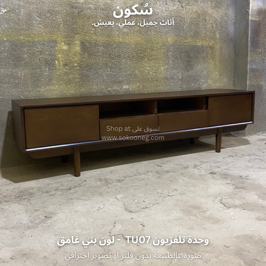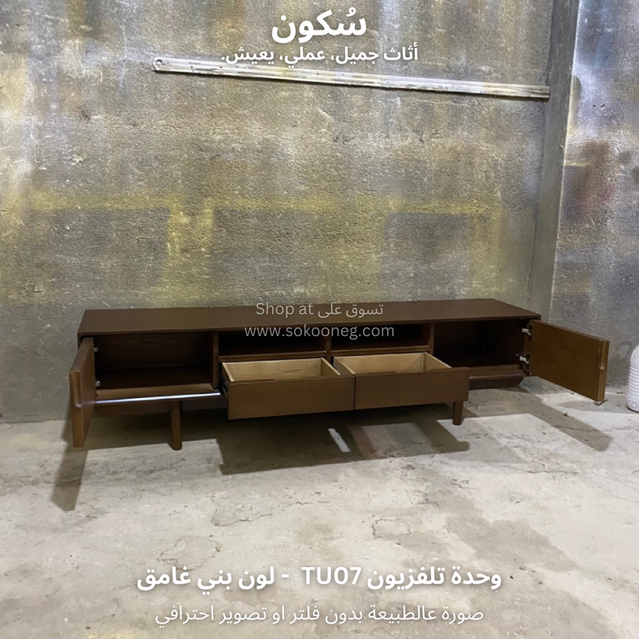 وحدة تلفزيون مع سطح واسع للاستخدام اليومي، تحتوي على بابين و درجين لتخزين الأغراض ورف واسع يوفر لك الوصول السريع للأغراض أو الأجهزة الإلكترونية.