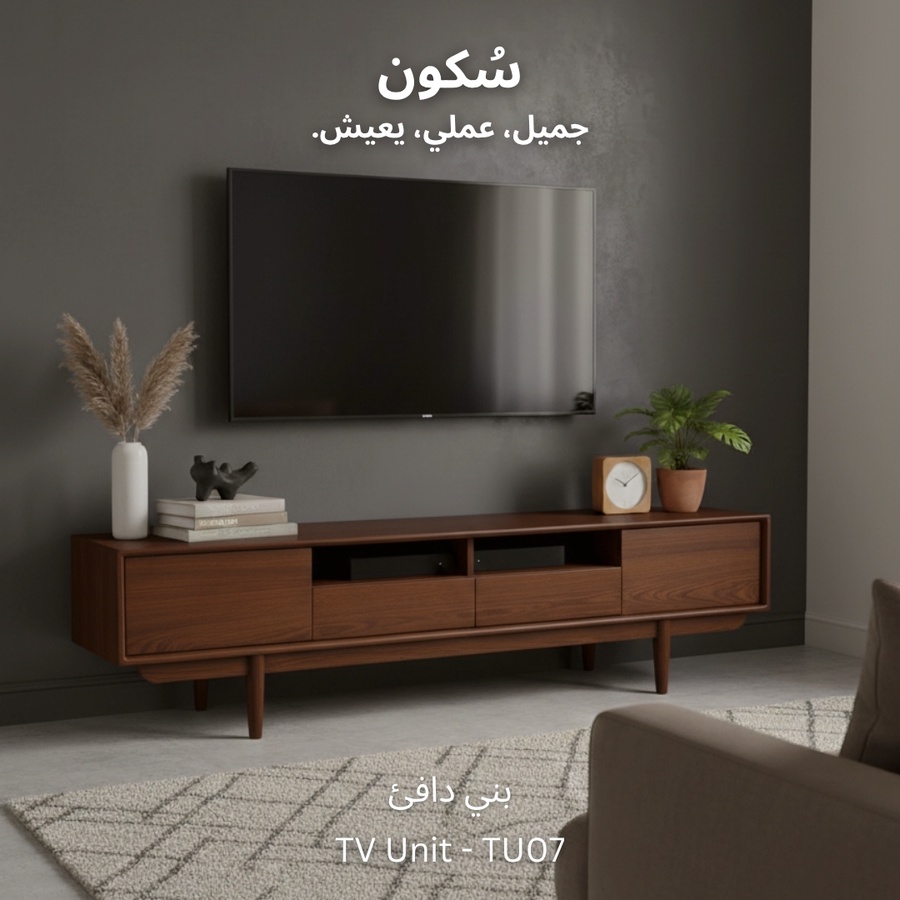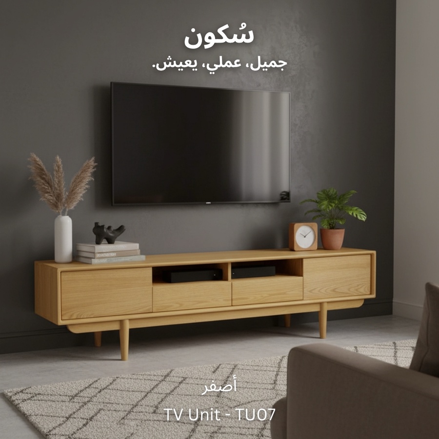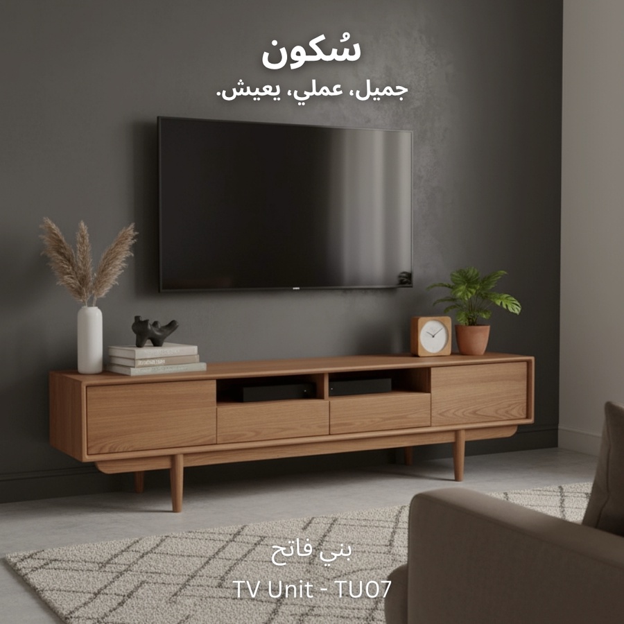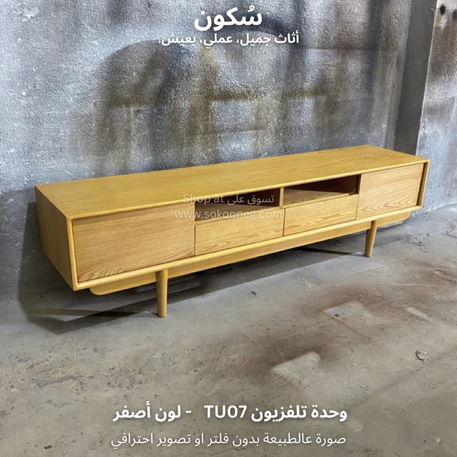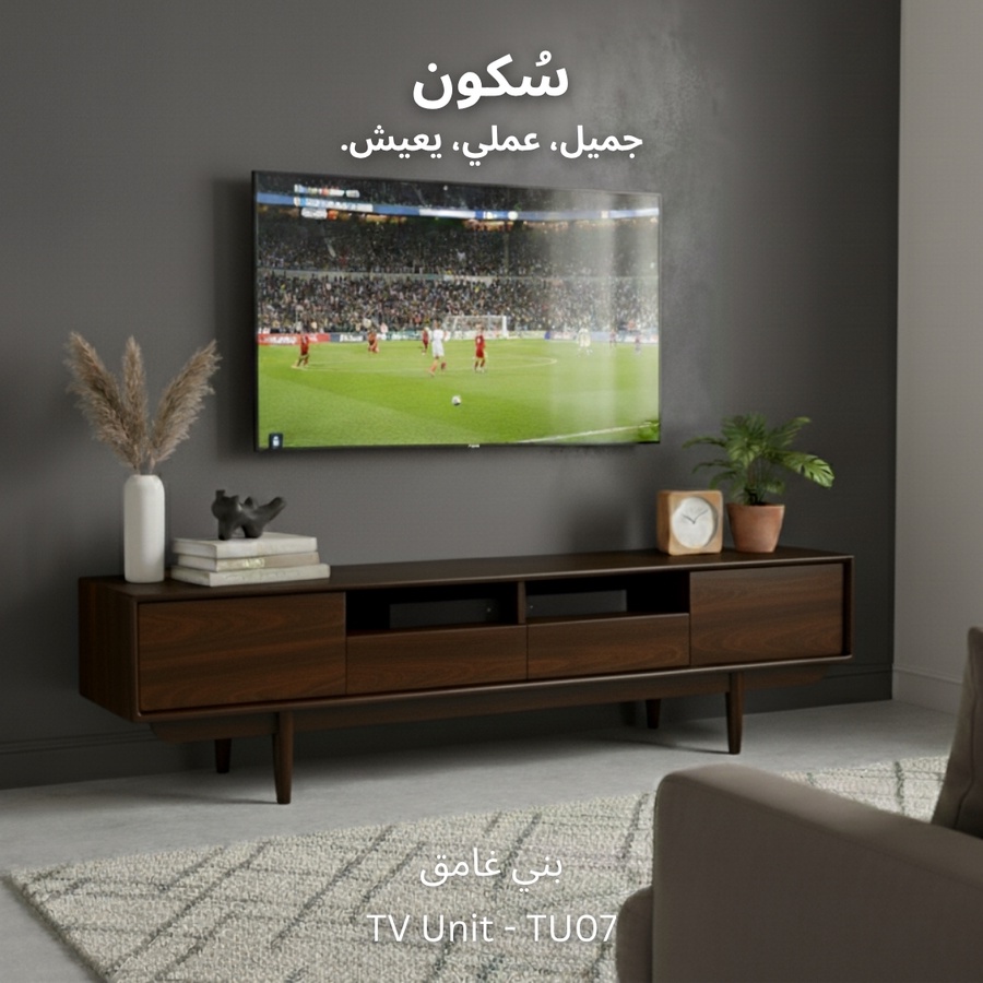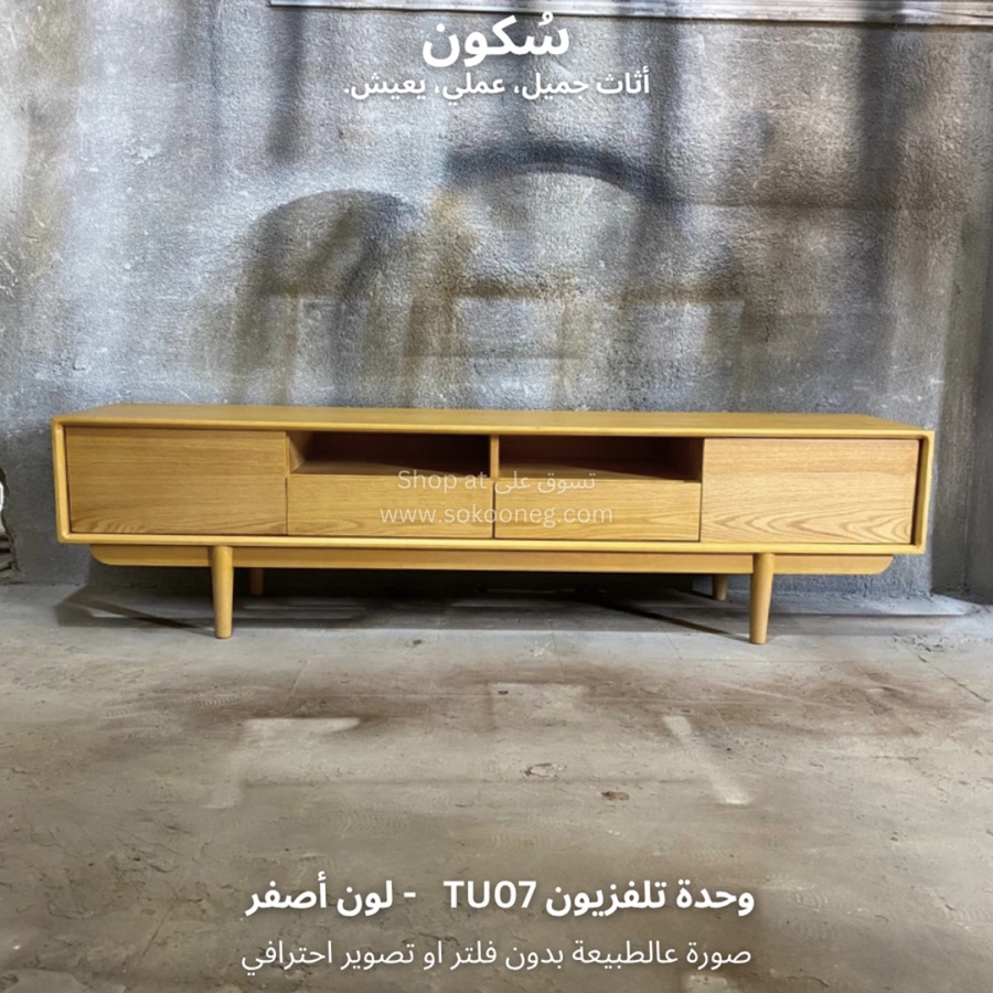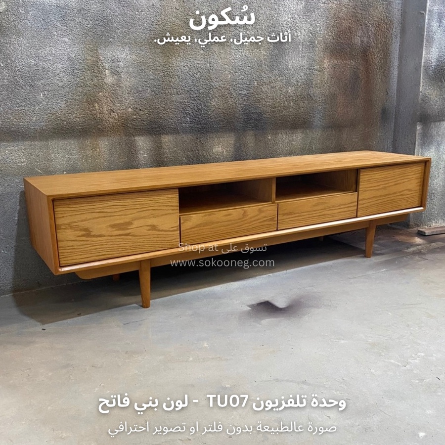 وحدة تلفزيون مع سطح واسع للاستخدام اليومي، تحتوي على بابين و درجين لتخزين الأغراض ورف واسع يوفر لك الوصول السريع للأغراض أو الأجهزة الإلكترونية.