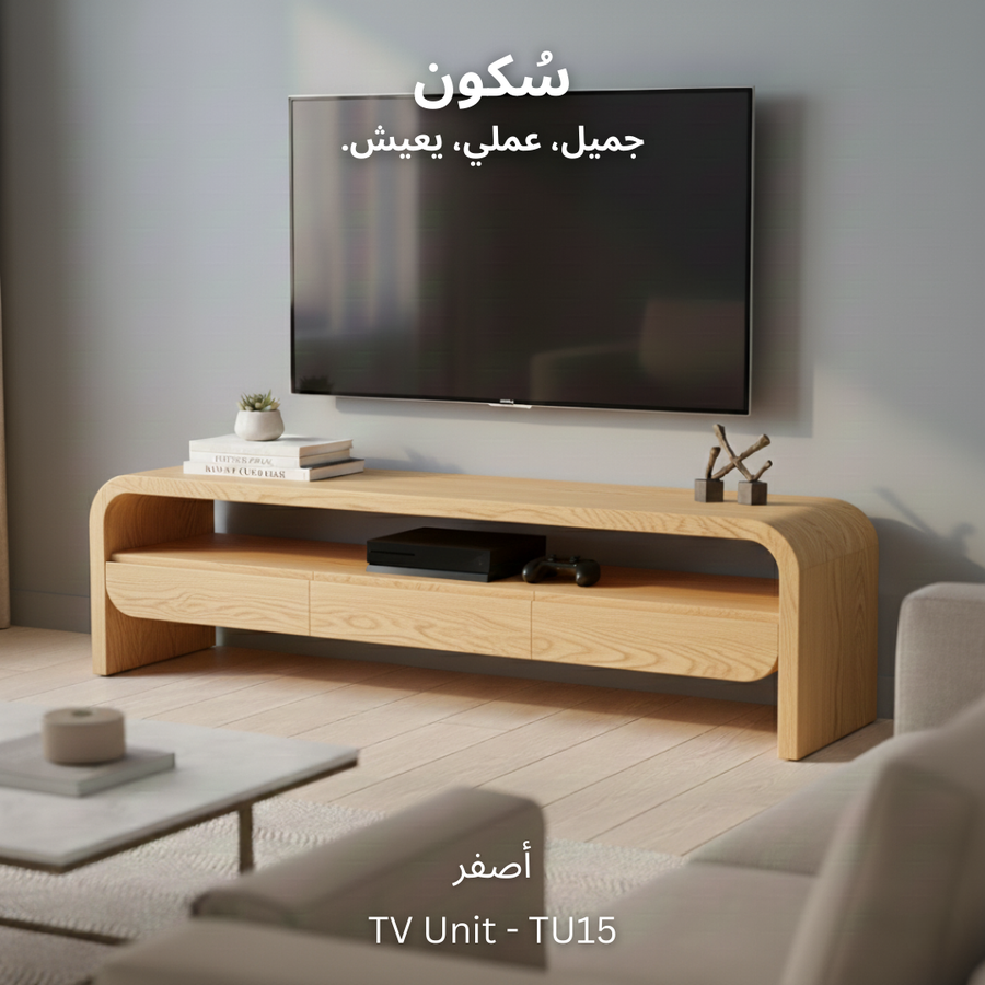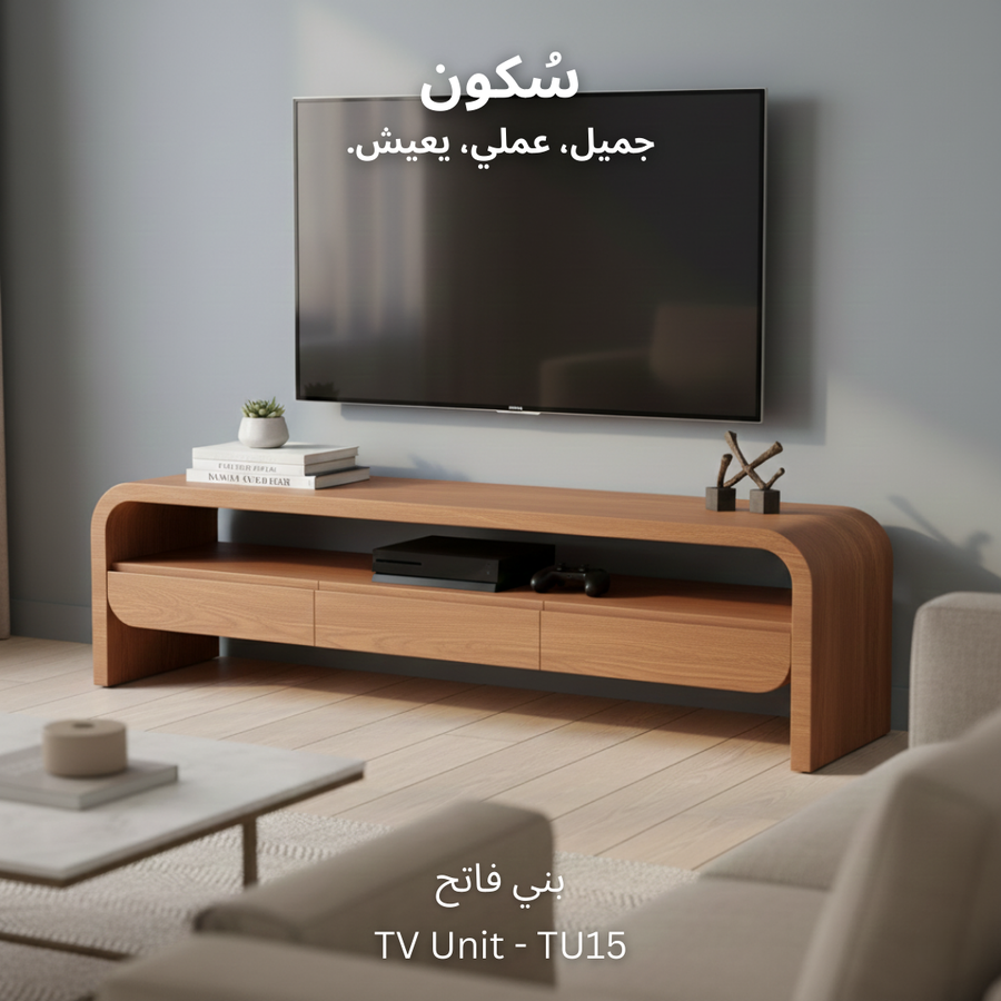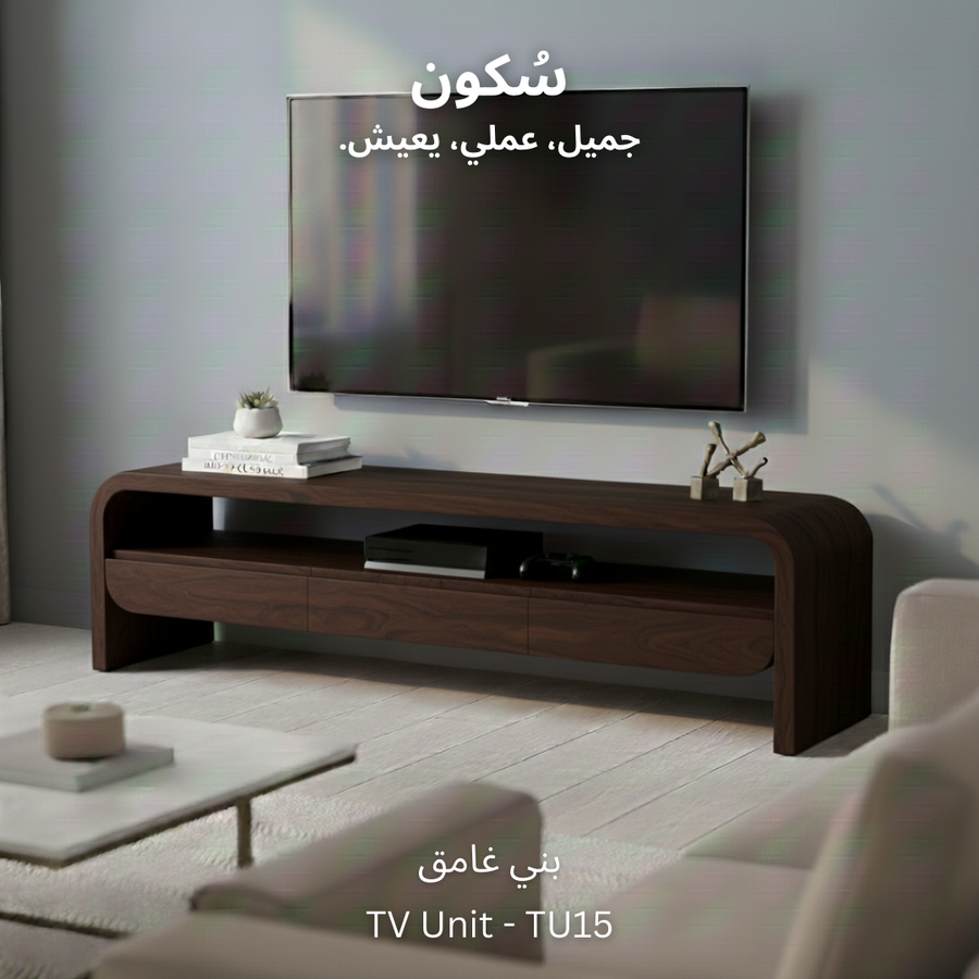 وحدة تلفزيون مع سطح واسع للاستخدام اليومي، تحتوي على ٣ ادراج لتخزين الأغراض ورف واسع يوفر لك الوصول السريع للأغراض أو الأجهزة الإلكترونية.